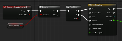 - IA_E 를 통해 E키를 누르는 순간 bIs Player Range가 true면 상호작용이 시작 되도록 블루프린트로 구현