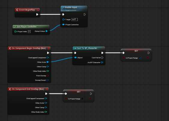 - 이벤트 그래프에서 Enable Input을 이용 캐릭터 Controller에서 받은 Input 값을 사용할 수 있게 하고 Overlap 상태와 아닌 상태의 Bool값을 bIs Player Range를 이용해 받음